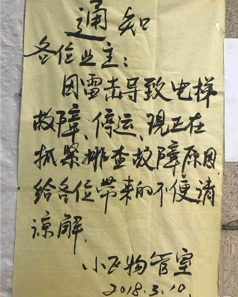 最近,家住咸陽(yáng)一小區(qū)的很多住戶遇到了麻煩,他們的生活特別不方便,因?yàn)樾^(qū)的電梯罷工已經(jīng)幾天了,這是咋回事呢? 原來(lái)事發(fā)的小區(qū)只有一棟樓,分為三個(gè)單元,每個(gè)單元只有一部電梯,而電梯突然癱瘓的原因,竟與一聲驚雷有關(guān)!
