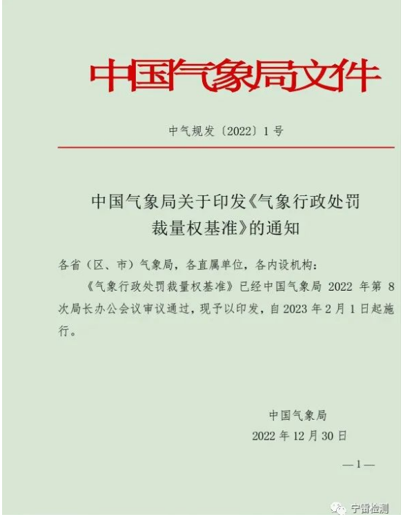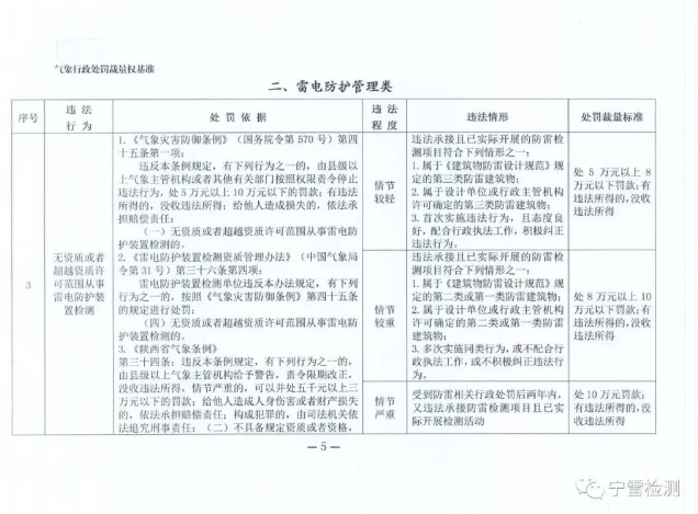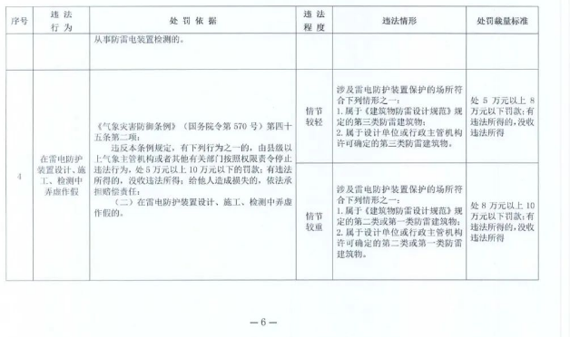 為了規(guī)范氣象行政處罰裁量權(quán)行使,促進(jìn)依法、合理行政,維護(hù)公民、法人和其他組織的合法權(quán)益,依據(jù)《中華人民共和國行政處罰法》、《氣象行政處罰辦法》等法律法規(guī)規(guī)章和《國務(wù)院辦公廳關(guān)于進(jìn)一步規(guī)范行政裁量權(quán)基準(zhǔn)制定和管理工作的意見》,結(jié)合氣象工作實(shí)際,中國氣象局制定了《氣象行政處罰裁量權(quán)基準(zhǔn)》,自2023年2月1日起施行。其中第二款對雷電防護(hù)管理類氣象行政處罰裁量權(quán)基準(zhǔn)做出以下規(guī)定: